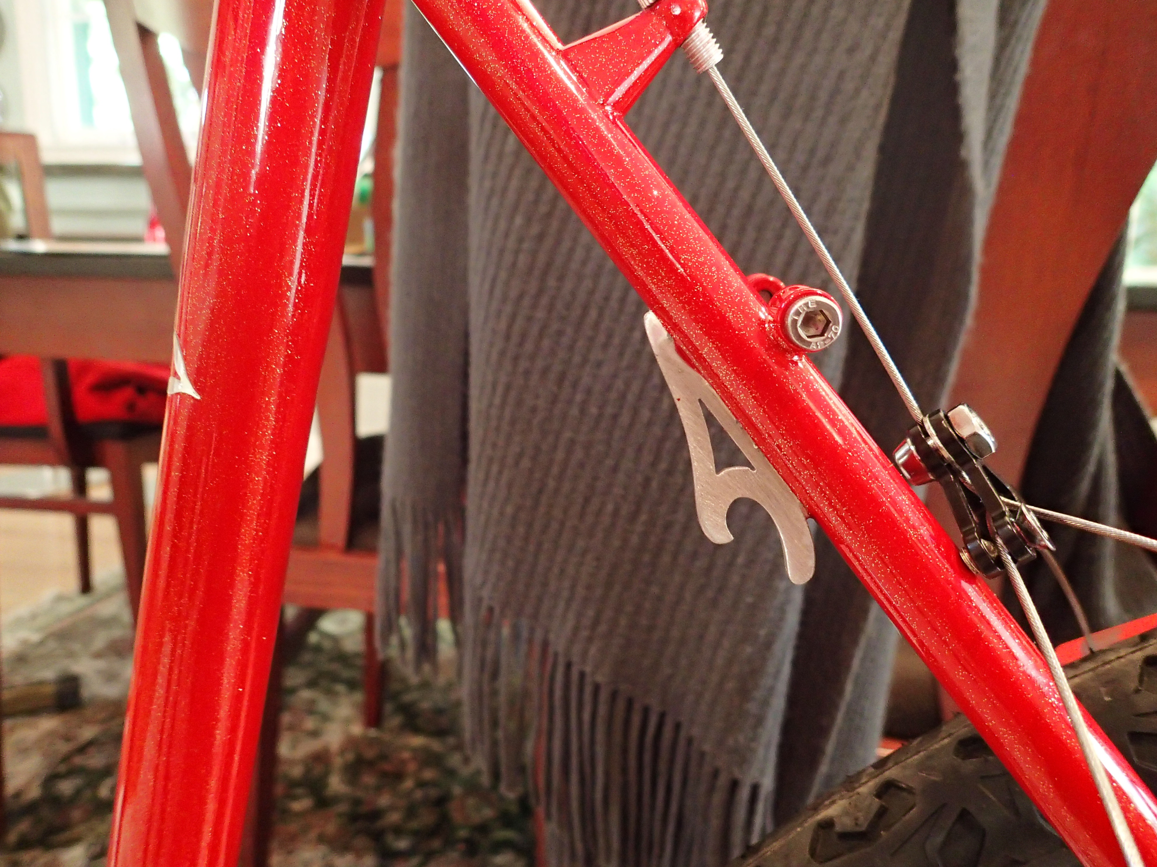 At a glance there is nothing unusual or extraordinary about our bikes–except our handlebars. I often catch other cyclists doing a double-take when they glance at our bikes and I’m sure it’s because our handlebars are unconventional. Sometimes called “butterfly handlebars”, they’re sort of like traditional road bike handlebars, except flattened so that they’re on the same plane as the road. While not so attractive, they’re comfortable because they afford a number of hand positions. They’re also designed to keep us in a more upright sitting position rather than leaning over in the classic Tour de France pose. (Check out this excellent overview about the various kinds of handlebars and why some are better than others for touring.) In the photo here I also have a t-shaped attachment in the center designed to accommodate additional stuff, like my speakers, iPhone mount, etc. We’ll cover that in a future blog about our “cool accessories and gear”. Oh, and be sure to click on the photo to zoom in so you check out the fork cap–Joy bought me a custom cap that highlights my Stanford alumnus status.