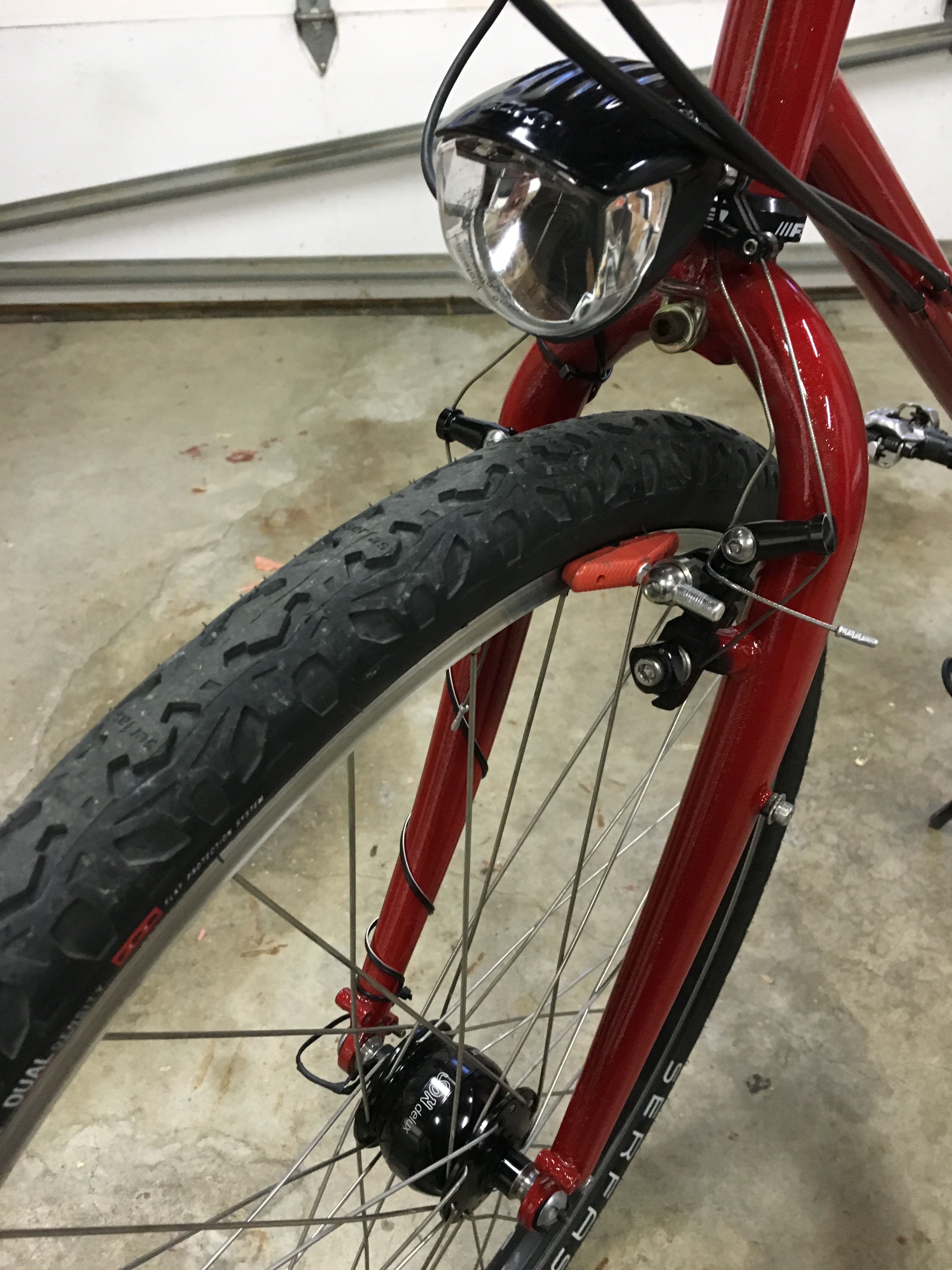 Our front wheels have built-in hubs that generate electricity to power our really powerful front lights. Whenever the front wheel is spinning, we’re using that energy to power the front light. No need to worry about dead batteries! Even better, there’s a USB plug so we can charge up our phones, GPS, or other devices, while we’re riding. (The USB connector is what’s dangling off the center of my handlebars in the photo at the top.) This feature will simplify the Ritual of Charging at the end of each cycling day.