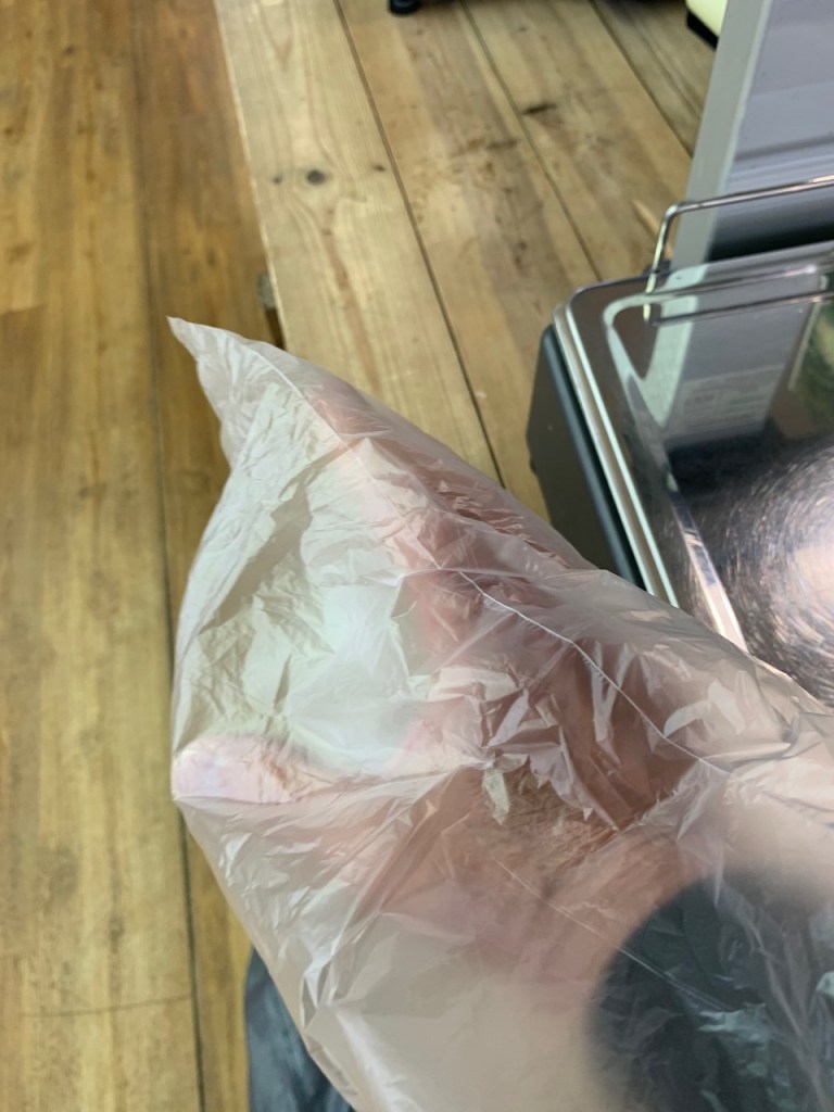At the grocery store they’ve installed tall clear plastic barriers between shoppers and the checkers. The barriers start on the belt where you places your goods to be scanned and goes all the way to where you bag your own groceries. Also, they now want us to put on gloves before touching produce or items on shelves. Except the grocery store’s not gonna spring for gloves for everyone, so they’ve set up a stand at the front of the store for us to put on produce bags as gloves. (They do have bajillions of these bags.) It works great. Just remember: these bags are not toys!