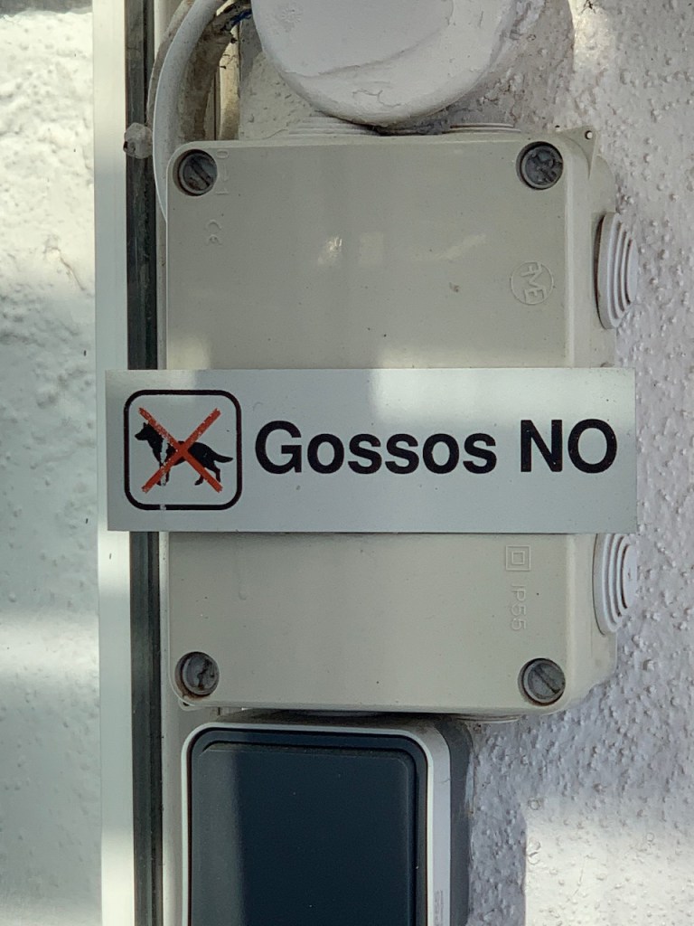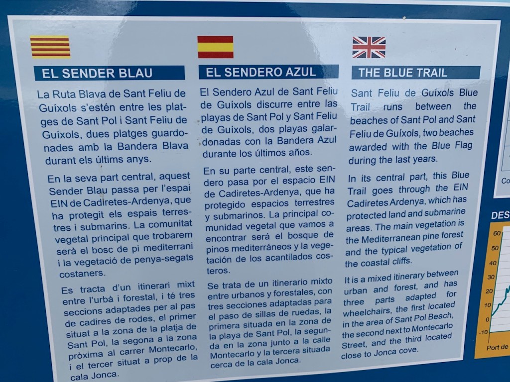 I took the left picture (below) while walking the trail that runs along the coast (and right by our apartment). It’s a great example of how Spanish and Catalan are similar but different. (Click on the left image to see the sign in its entirety.) If this pandemic leads to the fall of humanity as we know it, this sign could be a potential future Rosetta Stone!