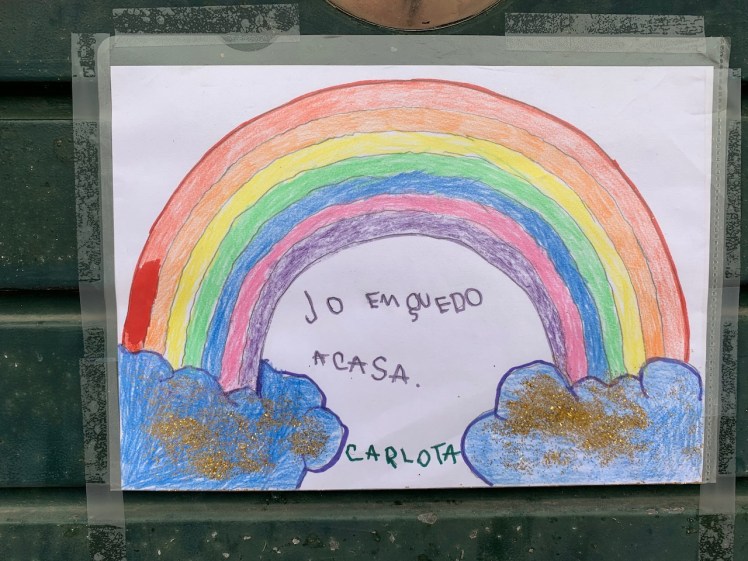 The feature image (repeated below) is courtesy of a local Spanish child named Carlota who taped this to her front door. She writes, in Catalan, “Jo em quedo a casa” (I stay at home).