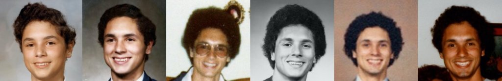 Phase IV. Adulthood photos, when I discovered the value of scheduled haircuts and hair gel. Note that the photo when I’m 50 (4th picture) doesn’t show that I’d dyed it blue. No worries if you couldn’t tell. No one else noticed at that time. Just as no one noticed when I dyed it blue to celebrate turning 40.
