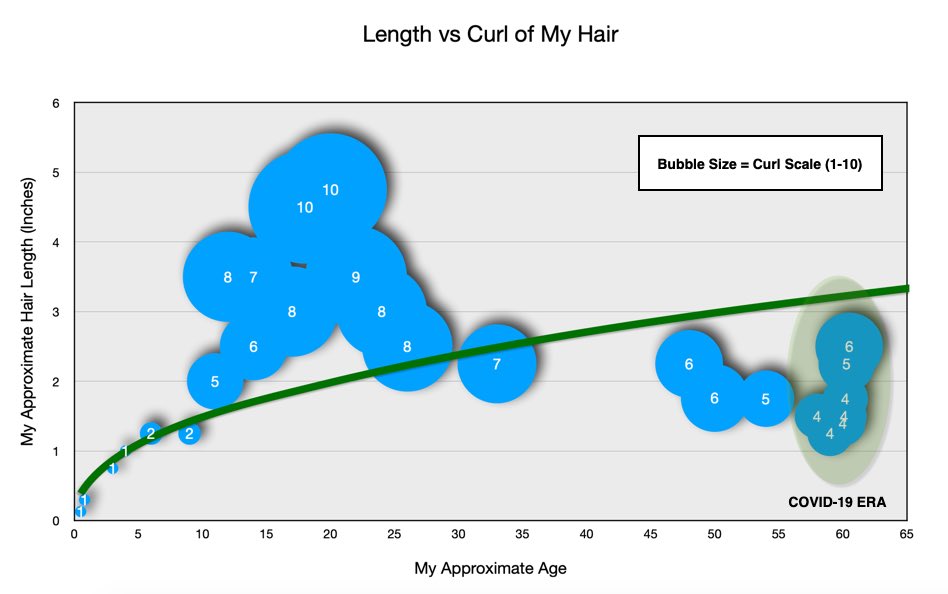 In the spirit of the overwhelming number of visualizations related to flatting the curve, I present my own version of it: Flatting the Curl, which represents the impact of my hair length on curl over the years.