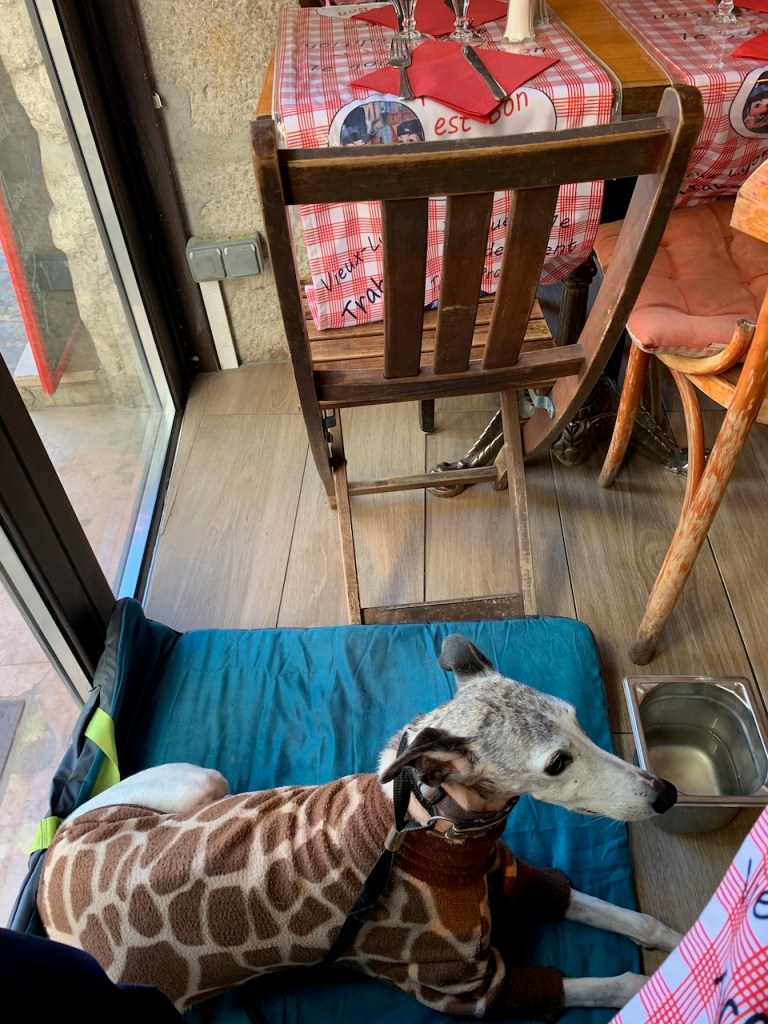 Restaurants and such. In the US, you typically can’t bring dogs into restaurants, though most restaurants are copacetic with dogs on the patio as long as you can get to the outdoor seating without going through the restaurant. In France and Italy, unless there’s a sign specifically forbidding dogs, you’re golden. (Even if you’re not a retriever.) Because Brighton is so skinny and bony, we always carried his roll-up bed so he’d have a soft spot to hang out while we ate a meal or visited a site.
