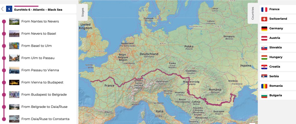 Our cycle route is primarily along EuroVelo 6, with occasional short spurs off to visit interesting sites (usually chateaus) or to get to our hotel. Just in case you couldn’t guess it from its name, EuroVelo 6 is part of a comprehensive set of bicycle routes throughout Europe. Quoting from their site: