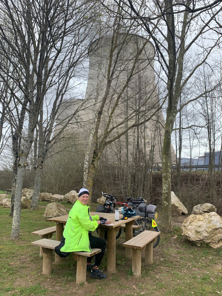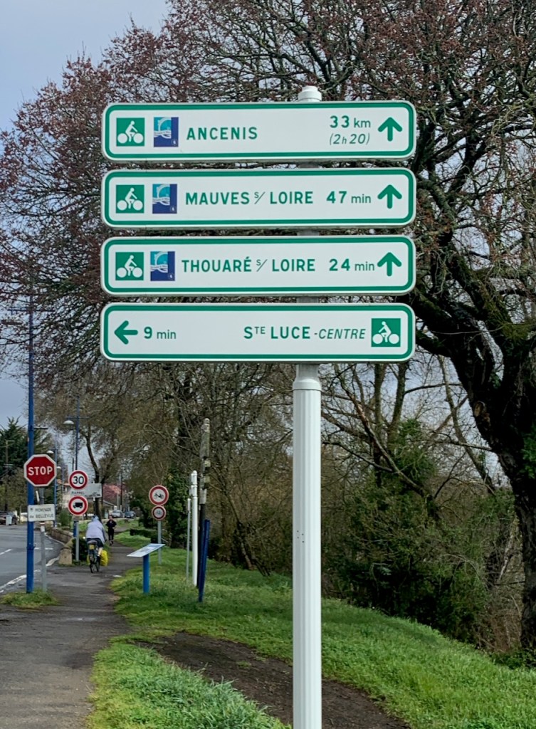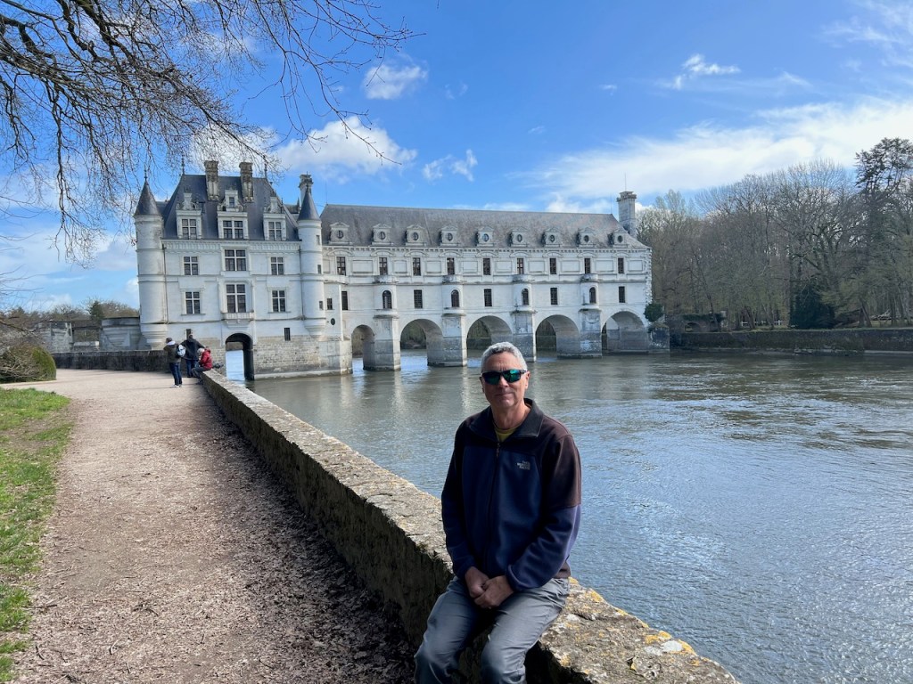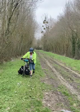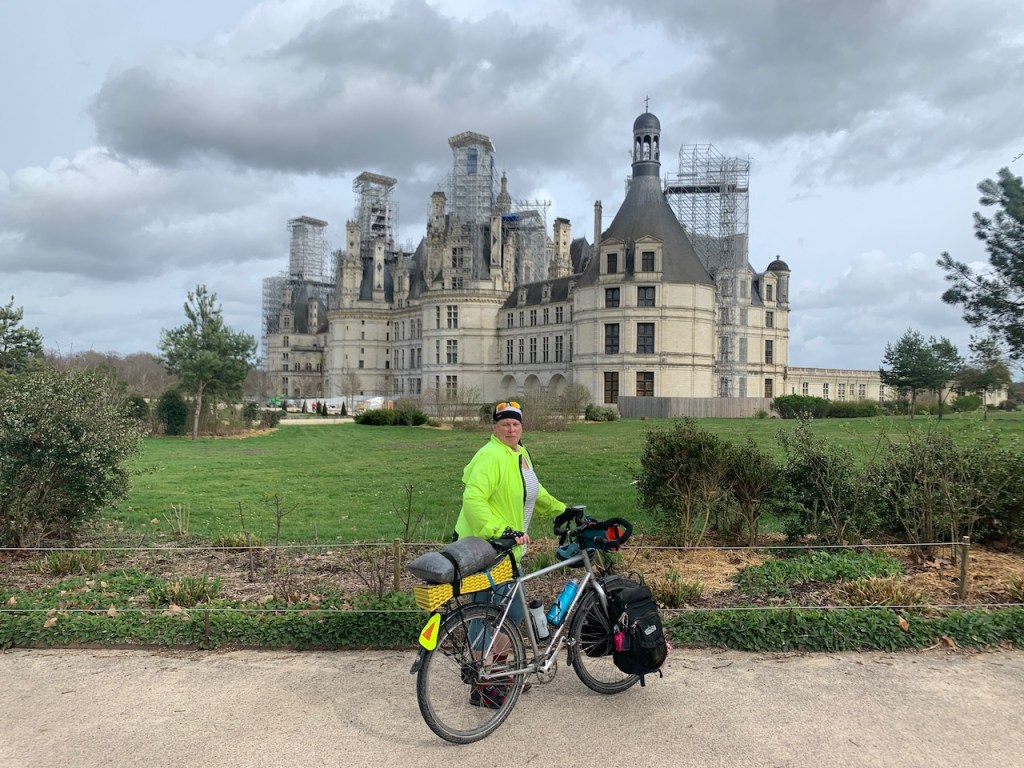 The other day, we were trying to get from our hotel which was close to Chateau Chenonceaux (a wonderful chateau, but about 8 miles off the Loire River & EuroVelo 6). Google map lady started off well enough, guiding us along narrow bike-friendly streets or designated bike paths. And then Google Map Lady sent us off along a series of rutted dirt farm roads (because, in Google logic, a shorter, flatter route is better than a paved route with any kind of hills or car traffic). At that point we were committed, and we could see in Google Maps that we weren’t that far from the river, so decided to keep with her directions.  Before long, we were walking our bikes through a grey, dense forest of still-leafless trees, where the only signs of spring were scraggly patches of grass bordering enormous puddles too deep to ride through or squishy mud you could sometimes ride through if you didn’t mind a little rear wheel fish-tailing every now and then.