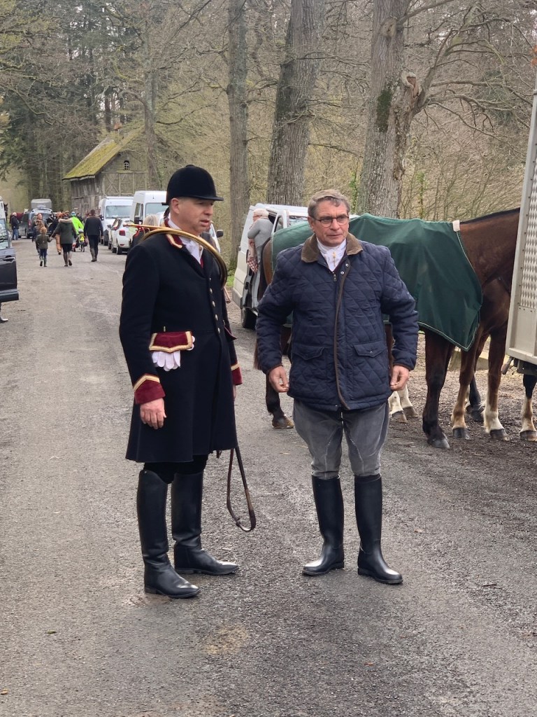 After about a mile the path dried out enough that we could ride, slowly, along a dirt road obstacle course of tree roots and potholes. Things started looking up when we began encountering intersections, even if the other paths were in equally bad shape. After a few Google-directed turns, the road improved to a nice packed fines, a sure sign we were nearing civilization! We’d been riding for about 10 minutes when the road dog-eared to the right. As we turned the corner, we were surprised to see a large group of people dressed in classic hunting gear, some even carrying French hunting horns draped on their shoulders, horses, hunting dogs, horse trailers, and lots of spectators lining both sides of the road.  We’d stumbled across a hunt that was gearing up to set off.
