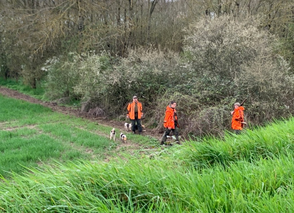 Not long after passing the second set of hunters. a hundred yards ahead of us we saw two dun-colored animals break from the forest on our left, race across the expanse of grass bordering the levee, up the grassy slope, bound across the 20 foot-width of the levee top in two leaps, then race down the slope and into the forest on the other side. I said it was two deer. Joy was sure they were French hares (which, based on her personal observation a few days before, can get as big as our medium-sized dog, Brighton). The animals (deer, trust me) had not quite reached the top of the levee when a pack of barking dogs emerged from the forest, hot in pursuit. Barking and braying, up and over the levee they went, then down into the forest on the right. We lost sight of the dogs, but could still hear their excited call-to-arms coming from the nearby forest.