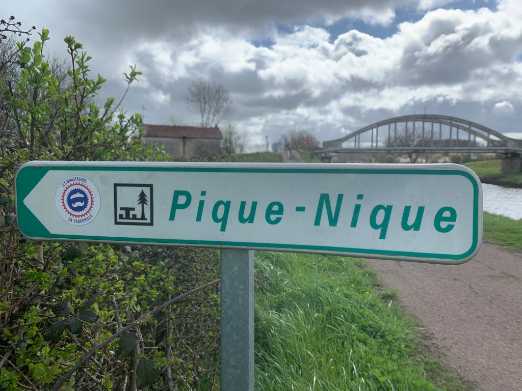 EuroVelo 6 is often easy to follow as it’s usually well signed (if you are good at keeping an eye out for sometimes subtle little path indicators). The majority of the time we’re traveling along dedicated cycle paths, most of them even paved. But sometimes we’re moving along dirt paths bordering canals and farmland or navigating through twisty little town roads. As a result, navigation can be incredibly easy or absolutely exasperating. We mostly rely on pre-defined Ride With GPS (RWGPS) cycling routes that are linked to EuroVelo 6. This application helps us map out how far we want to ride each day, and know with a fair amount of certainty that it’s, say, a 43 mile day and that 87% will be paved. These RWGPS routes have built-in, mostly accurate cues so our phones will talk to us, saying things like, “In 200 feet, turn right onto Rue du 71è Bataillon de Chasseurs à Pieds,” except that every time the phone announces a French road name, it’s like a Saturday Night Live skit where an ugly American is purposely massacring French.