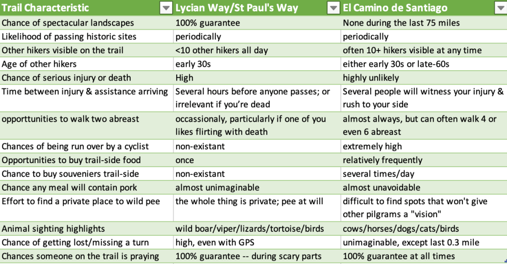 Keep in mind that we only walked portions of each route. We missed out on the scenic/wilderness sections of the Camino and skipped the easy, crowded stretches of the Lycian Way & St Paul’s trails.