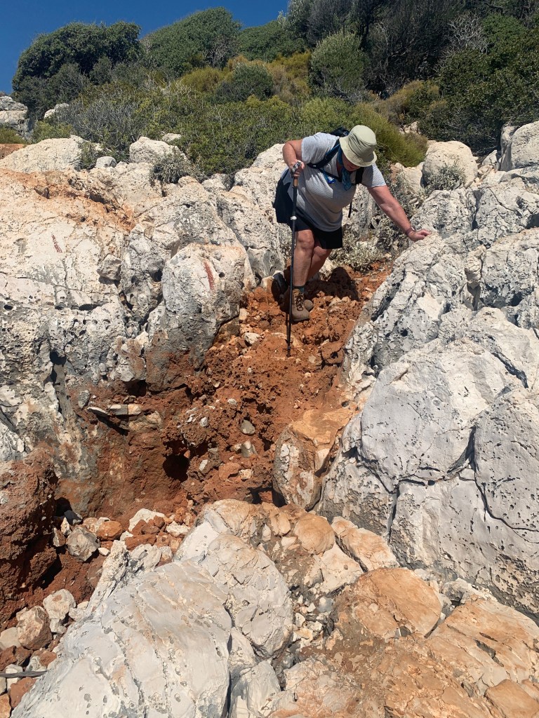 The trail is marked with a white stripe above a red stripe, usually painted on a rock or tree trunk. The marks aren’t always easy to see and other hikers sometimes pile stones to help identify the route. Even with the piled stones, following the trail is not simple. In some sections there are a lot of criss-crossing goat and wild game (mostly boar) game trails which look much more traveled than the actual trail, so it’s easy to find yourself following the wrong path. Or, you’re traversing rocks and boulders or squeezing your way through mazes of overgrown vegetation and most of your focus is on keeping your footing rather than looking for faded trail marks. Even with the GPS, we’d sometimes find ourselves several hundred feet off trail. More than once I found that I had lost the trail and the Garmin had lost signal. To add injury to insult, bushwhacking back to the trail sucked because that part of Türkiye has a lot of sharp, spiky plants. And rocks. My boots have gouges in them. My legs were worse. There were also a few sections of the trail that were just plain hairy because they hugged rocky cliffs and the footing was treacherous.